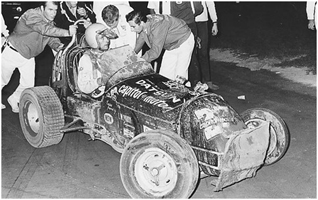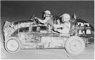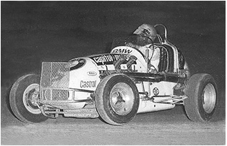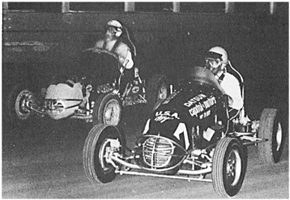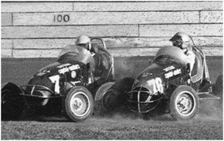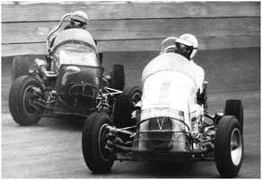 Barry underneath “Miraculous Mel Kenyon from Lebanon, Indiana, USA” in a match race against Mel in the McClure Offy at Liverpool.