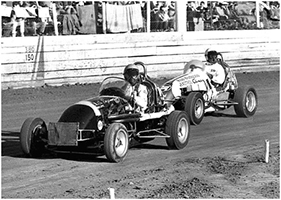 Barry is down low on the track as Bob “two gun” Tattersall in the Kischell Offy attempts to rim-ride around the outside at the Royale.